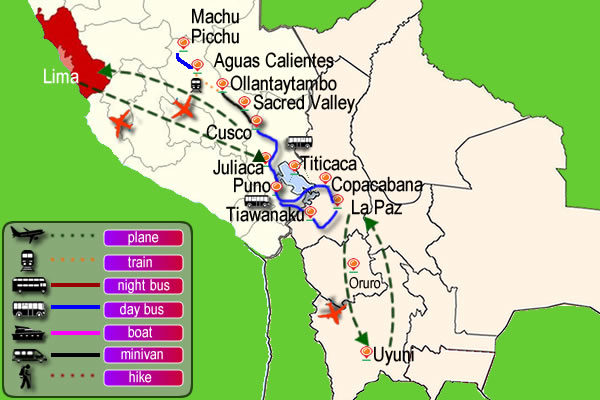 Route::Peru Bolivia Trip in 11 days, a famous, solid and well-known tourist itinerary from Lima to Machu Picchu crossing the South American Andes to reach the captivating Uyuni salt flat.
